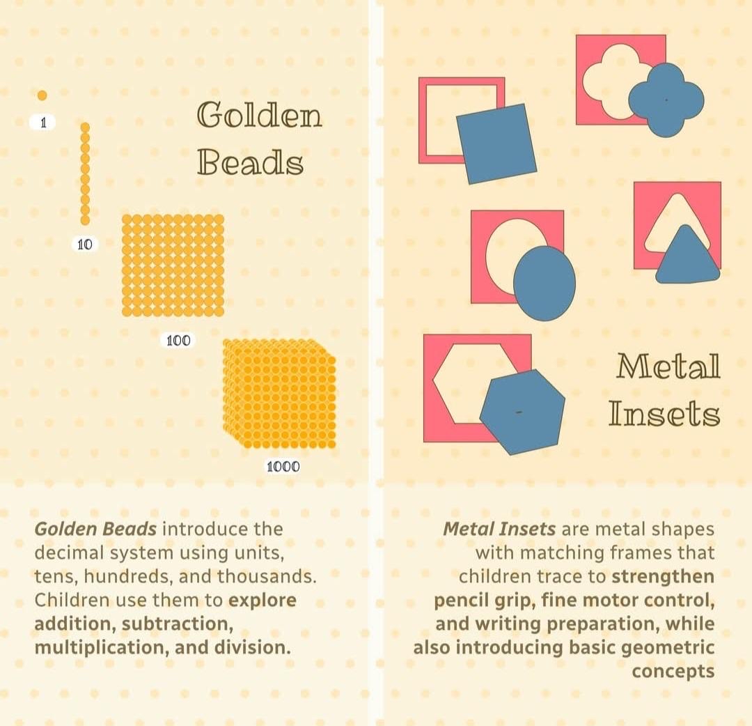 This begins by first combining the sound, shape and visual appearance of the letter. The child then starts to build 3 letter phonic words followed by reading. The child progresses to longer words with the common spelling patterns known as phonograms. Writing skills are learned by colouring intricate shapes drawn with insets, and sandpaper letters are experienced by touch as well as by sight and sound. A wide range of both story and reference books are always available in the classroom.
