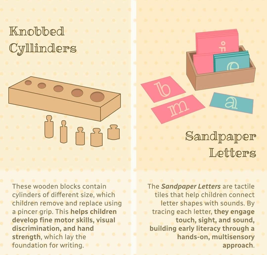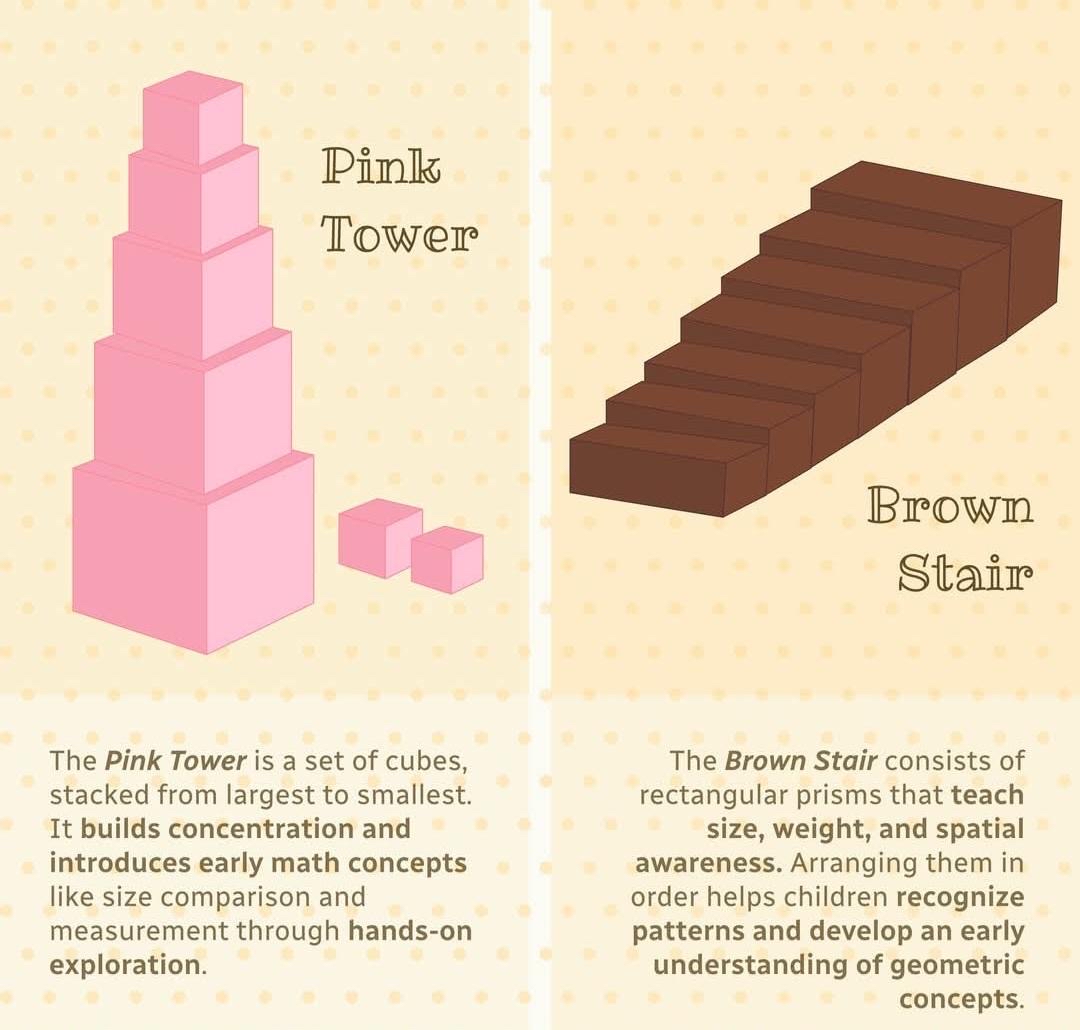 The sensorial equipment has been specially designed to help the child refine and develop the use of their senses. This will help children understand concepts within the environment, e.g. colour, temperature, size and dimensions. Due to the nature of the equipment your child is also preparing for reading, writing and arithmetic.